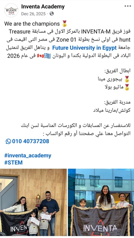 – تم تكريم الطالب بيجوري مينا عاطف الصف الأول الابتدائي اليوم الثلاثاء ٣ من مارس ٢٠٢٦م لحصوله على المركز الأول في بطولة الجمهورية للروبوت وتأهله للبطولة الدولية في اليونان.